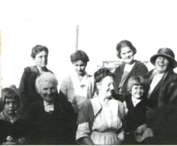 Joan (child in black coat on the right), Lilian (in the black hat, holding Joan’s arm) and Olivia (far left) with family friends in Saratoga.